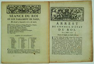 de renouveler, casse l'Arrêt du Parlement et enjoint au Duc d'AIGUILLON de continuer ses fonctions de Pair de France. À Paris, de l'Imprimerie Royale. 1770; 2pp in-4° + «SÉANCE DU ROI en son Parlement de Paris du 3 sept. 1770. Concernant «l'affaire intentée contre le Duc d'Aiguillon» en Bretagne. Impr. à Lyon, chez Valfray imprimeur du Roi, 1770; 7pp in-4°.