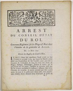 - (NORTH) LILLE GENERALITY. "Arrest of the King's Council of State, containing Regulations on the TOLLS & BACS within the scope of the generality of LILLE" - of March 10, 1771 - Bandeau - followed by the State of the Tolls of this generality, which have been confirmed; of those which are suppressed, & of those which remain to be verified. - (in tables: Date of the stops, Names of the owners and the Engagers, Places where the Tolls are collected). - in Paris, from the imprimerie Royale 12pp in-4°.