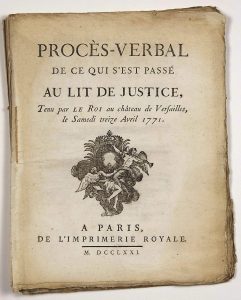 - HELP. SALT GRENIER. "Minutes of what happened at the bed of justice held by the KING at the Château de VERSAILLES on Saturday, April 13, 1771." - In Paris, from the Royal Printing Office, 1771; 47pp in-4° - (Edict of the King, suppressing and creating Offices in the Parliament of Paris; Edict of the King, suppressing the Court of Aid of Paris; State of Elections, Salt Loft, Judges of the Treaties & Judges of the Mark of the Irons nationals to the Superior Councils; Edict of the King suppressing the Grand Council;...)