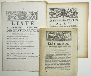 - ARTOIS. ARRAS (PAS-DE-CALAIS). 3 Printouts: "STATES OF ARTOIS - List of gentlemen of the Nobility of the States of Artois, to the General Assembly of 1750. & their residences." - 3pp in-folio - Decorative headband + (MASTER OF HOUSEHOLDERS & INSTRUMENT PLAYERS) "Edict of the King, bearing abolition of the Office of King & Master of HOUSEHOLDERS." - Registered with the High Council of ARRAS on May 17, 1773 Bandeau & Lettrine - From the Printing Office of Guy Delasablonnière, printer of the Court and the High Council of ARRAS, 3pp in-4°. + (PAS-DE-CALAIS) "Letters Patent from the King, concerning the Colleges of ARRAS and BÉTHUNE." Printed in Versailles in June 1777 - Printed in Paris, by the Imprimerie Royale, 1777, 11 pages in-4°. Painting, Decorative band.
