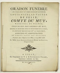 - "FUNEROUS ORAISON by Louis-Nicolas-Victor DE FÉLIX Count de MUY, Marshal of France, Minister of War, Here before Menin de Mgr le Dauphin, Director and Administrator of the Hôtel Royal des Invalides., pronounced on April 24th 1776 by Messire De BEAUVAIS Bishop of SENEZ." - From the Printing Office of N.J.B. Peterinck-Cramé, at LILLE (59) - Impr. 40pp in-4°.
