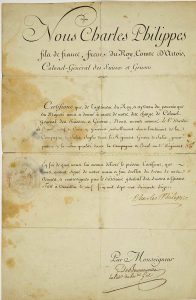- CHARLES X (Count of ARTOIS, Versailles 1757 - 1836) King of France 1824 to 1830 - Coin signed CHARLES PHILIPPE Fils de France, Frère du Roy, Comte d'ARTOIS, Colonel-General of the SUISSES & GRISONS (Impressed letterhead) Done at VERSAILLES on June 9, 1776. Let us certify that, with the approval of the King; we have appointed Sr Martin de Buol, a native of Chur in Grisons, currently Second Lieutenant of the Company of Salis Soglio in the Regiment of GRISON de SALIS, to pass in the same quality in the Company of BUOL to the said Regiment." Seal under paper - 1p large in-folio (light wetted).
