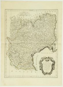 - CARTE de 1777: «Carte des Gouvernements de LANGUEDOC, de FOIX et de ROUSSILLON avec la partie orientale du gouvernement de Guienne, assujettie au Ciel par M. BONNE Maître de Mathématiques à Paris, 1771» A Venise par P. Santini, 1777....