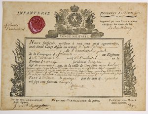 Septembre 1777. Congé absolu à Pierre LALANDE dit NEUFCHATEL Caporal, de la Compagnie de FOLMONT au Régiment de VIVARAIS infanterie - 1 page gravée (22 x 29), remplie à l'encre. Cachet de cire du régiment. Décoratif.