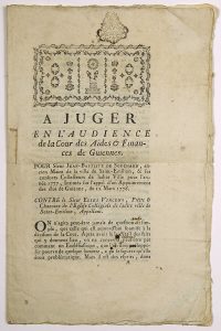 - (GIRONDE) SAINT-ÉMILION. 1778. MEMORY of Procès Impr. at Pierre PHILLIPOT, Imprimeur-Libraire, rue St James, opposite that of Gourgue. 1778, 8pp in-folio - with autograph notes: "TO BE JUDGED at the Audience of the Court of Aid & Finance of GUIENNES. For Sieur Jean-Baptiste DE SOUCHARD, Former Mayor of the City of SAINT ÉMILION, & his fellow Collectors of the said City for the year 1777, Respondents on the appeal of an Appointment of the Elected Officials of Guienne, of March 12, 1778. Against Sieur Elies VINCENS, Priest & Canon of the Collegiate Church of the said City of SAINT ÉMILION, Appellant." - Headband & tax stamp of the Generalitat of Bordeaux.
