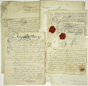 - BERRY. INDIA - Family AUCAPITAINE. 11 Rooms. (1749-1788) concerning Messire Louis AUCAPITAINE Écuyer, Seigneur de la Bernardière, former Captain of Grenadiers in the Regiment of Aquitaine & His wife Damoiselle Marie SAVARY AUCAPITAINE Widow of Sieur François AUCAPITAINE living Ecuyer, Captain in the Provincial Regiment of CHATEAUROUX Chevalier de l'Ordre Royal et Militaire de Saint Louis. File of documents concerning a complaint for insults against the Demoiselles, at Nosseurs les Maréchaux de France. Done in BOURGES in 1749; Supplies to Mgr d'ORMESSON Minister; Succession; Extract of baptism of the parish of VIC SUR HAUBOIS (Vicq-Examplet. Indre) Diocese of BOURGES 1778, and of LA CHÂTRE (Indre). Wax stamps of the Prévôté royale de la Châtre. Stamps of the Cabinet d'HOZIER.