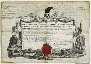 - MONTBAREY (Alexandre-Marie-Léonor de SAINT MAURIS, prince of) 1732 - 1796. Colonel of the Swiss of the Count of Provence, Secretary of State for War in 1777. Patent signed on his engraved letterhead as Marshal of the Camps and Armies of the King, Captain-Colonel of the Swiss of the Guard of MONSIEUR, Minister and Secretary of State with the Department of War. NATIONAL AWARD PATENT and pension for a Sergeant of the Regiment of Flanders, native of MAUVAISIN (Haute-Garonne), having served 27 years. Done at VERSAILLES (78) on 15 April 1779. 1p engraved (22.5 x 32) in ink, laminated on parchment. The Patent was modified during the Revolution. The Signs of the Royalty were crossed out and replaced by the attributes of the Republic. A Phrygian flag replaces the Crown and a wax Seal of the French Republic masks the Coat of Arms of MONTBAREY.