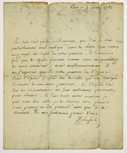 - (MUSIC) PAPILLON DE LA FERTÉ Denis Pierre Jean (Châlons-sur-Marne [51] 1727- beheaded 1794) Intendant des Menus Plaisirs du Roi; Savant et Ami des Arts - Lettre Autogr. Signed "De la Ferté" - Paris August 4, 1780, 1p in-4° - to Mr. AUBRY, resident of the Royal ACADEMY of Music in L'ISLE-ADAM (95) (address, M.P.) - About his pension of Opera. "...I should very much like things to be as you seem to have heard them; but unfortunately it is only a question of your OPERA pension, the Opera of which will take place in the City, which is responsible for all the former pensions. As far as the King is concerned, the circumstances are in no way favourable to obtain it..." (weary pleats)