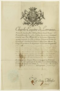 - Charles Eugène de LORRAINE, prince of LAMBESC (1751-1825) called "Le Sabreur des Tuileries". Colonel, Cousin of Queen Marie-Antoinette. Exhibit signed "Charles Eugène de LORRAINE, Prince of LAMBESC, Duke of ELBEUF, Peer and Grand Ecuyer of France, Governor and Lieutenant General in ANJOU, Governor of the City and Castle of ANGERS and of the PONT DE CÉ and GRAND, Hereditary Seneschal of Burgundy, Mestre de Camp, Owner of the Lorraine Dragons regiment." (Engraved heading, vignette of his coat of arms.) 1 page (37 x 24). VERSAILLES (Château de Versailles 78) 30 December 1780. Certificate for Sieur Joachim de KÉRAMPIL of the Province of Brittany, son of Sieur Charles Robert de KÉRAMPIL former Councillor at the Parliament of Brittany, "was received PAGE DU ROY in his Grand Stable on 26 Dec. 1770, and that in this capacity he served His Majesty until the day he entered Sous Lieutenant following the Regiment of BERRI CAVALERIE".