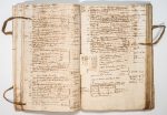 qu'il a des frère et sœurs religieux, 3 domestiques, un feudiste, un homme d'affaire à Castelnaudary (Aude), etc. Le livre de compte est truffé d'un dessin à la sanguine représentant une jeune femme, sur une feuille séparée (31 x 20 cm). Cahier avec couverture en parchemin. On joint un Cahier, du même, peu rempli.