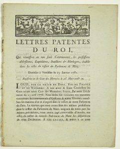 - METZ (57). GOLDSMITHS, LAPIDARIES. 1781. "Letters Patent from the King, uniting in one Community the professions of Goldsmith, Lapidary, Jewellers & Clocks, established in the Cities within the jurisdiction of the Parliament of METZ." Given at Versailles on January 25, 1781 - Bandeau. Printed 6pp in-4°.