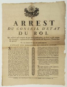 - CUSTOMS. 1781. IRON. ILLE-ET-VILAINE "Decree of the King's Council of State, which orders that from the moment of publication, tin irons coming from abroad, shall pay at all entrances to the Kingdom, Thirty cents a quintal." On January 11th, 1781. Published by CAZE, Baron de la BOVE, Intendant of Brittany, in RENNES 1781. Printed in RENNES (35), by the Widow François VATAR, Printer of the King and Parliament, 1781. Cupboard (46 x 35) State B+.