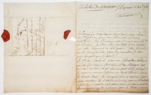 Le Chevalier de ZIMERMAN - BAPAUME (62) 8 Décembre 1782 - à M. de STE JAMMES Trésorier de la Marine et des Colonies, en son Hôtel Place Vendôme à Paris (Adresse + MP + Cachet de cire aux armes à l'ouverture) - “Arriverai-je trop tôt ou trop tard pour vous faire mes sincères compliments sur l'heureux accouchement de Mme de PUYSÉGUR... Le Comte de DIESBACH arrive de GIBRALTAR. L'éloge mérité qu'il nous a faite de Mr de PUYSÉGUR est au dessus de tout ce que l'on peut dire puisqu'ils le regarde comme l'Officier de l'armée qui a le mieux servi; Les dangers qu'il a couru sont sans nombre. La Batterie ennemie nommé PICATCHO a fait tous ce qu'elle a pût pour vous le faire perdre heureusement qu'elle a donné dans la Basse, puisque dans ce moment vous devez jouir de sa présence mon ami. L'ayant laissé à CADIX, Voulez-vous bien me rappeler dans son souvenir... 2pp gd in-8°.