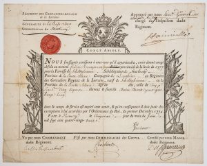 - CHOISEUL-STAINVILLE Maréchal de France. Régiment des GRENADIERS ROYAUX de La LORRAINE. Congé absolu pour Frédéric DEUXPOUCES Sergent provincial de la levée de 1777, Natif de Schiltigheim (67). Fait à NANCY (54) le 5 Juin 1783. Pièce signée...