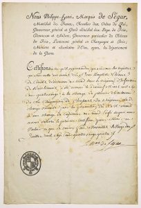 - Philippe Henri, Marquis de SÉGUR, Marshal of France in 1783 - Exhibit signed "Le Mal de SÉGUR" (The Evil of SÉGUR) on its letterhead engraved as Marshal of France, Governor General and Grand Seneschal of the countries of FOIX, DONNEZAN and ANDORRE, Private Governor of the castle of FOIX, Lieutenant General in Champagne and Brie, Minister of War. Certificate made in VERSAILLES on July 22nd 1784 - Seal "Let us certify to all that... Jean Baptiste Étienne De CORIOLIS Second Lieutenant in the Infantry Regiment of Bourbonnais was appointed on March 19, 1780, to the office of First Lieutenant of the Company of Hunters of the said Regiment...". 1p (37 x 24).