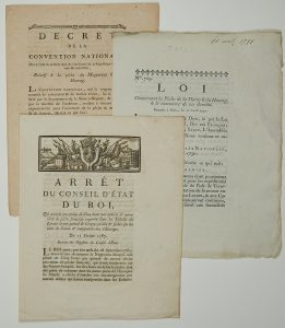 - FISHING. 3 Printed matter: "Decree of the King's Council of State, which grants a premium of Five pounds per quintal of dry cod from the French fishing fleet imported into the Levant, & per quintal of Congres caught & dried on the coasts of France & transported abroad." - of February 11, 1787 - Bandeau - Impr. in Paris, de l'Imprimerie Royale; 4pp in-4° + (FISHING IN NEWFOUNDLAND) "Loi concernant la Pêche de la Morue & du Hareng, & le Commerce de ces denrées." (Law concerning the Cod & Herring Fishery, & the Trade of these foodstuffs). - Given in Paris on April 10, 1791 - "The premiums and incentives enjoyed by the Cod Fisheries, both for shipments to the West Coast of the Isle of Newfoundland, and for the importation of Cod into Spain, Portugal, Italy, the Levant, & the French Colonies of America, shall be continued, strictly in accordance with the formalities which were prescribed for obtaining them, & payment of which shall be continued from the time when it ceased...". - Imp. A MELUN, chez Tarbé; 4pp in-4° + "Décret de la Convention Nationale du 15° jour du 1er mois de l'An 2, Relatif à la Pêche du Maquereau & du Hareng." - opening of fishing at will, without determination of any time - Imp. 3pp in-4°.