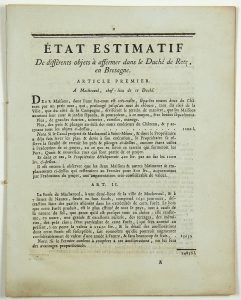- ATLANTIC LOIRE. MACHECOUL. PORNIC. - "Estimated state of various objects to be leased in the Duchy of RETZ, BRITTANY." (In MACHECOUL (44), chief town of this Duchy. Lods & sales & repurchases. City & Châtellenie of PORTNIC. Lots & sales & repurchases. Particular state of the forest of MACHECOUL, half a suburb of Machecoul & Seven leagues from NANTES. Detail of the improvements of various species, of which the Forest of Machecoul is susceptible by the circumstances & by Art.) c. 1788 - Impr. of G. DESPREZ, Imprimeur ordinaire du Roi, rue S. Jacques, 8pp in-4°.