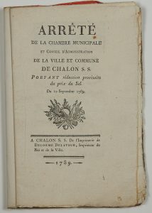 - SAÔNE ET LOIRE. 2 Imprimés: (1789. Réduction du Prix du SEL) «Arrêté de la Chambre Municipale et Conseil d'Administration de la ville et commune de CHALON S. S. (CHALON SUR SAÔNE) portant réduction provisoire du prix du SEL.” 10 septembre...