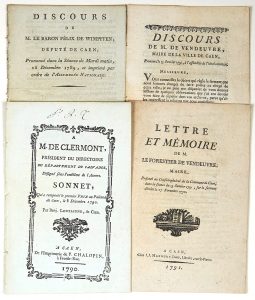 - CALVADOS. 4 Prints: "Speech of Mr. Baron Felix de WIMPFFEN, Deputy of CAEN delivered in the session of December 15, 1789, and printed by order of the National Assembly - About the conscription of the army of the Republic and against the speech of DUBOIS CRANCÉ - Impr. de 12pp in-8°, made in Paris at the Imprimerie Nationale - WIMPFEN Louis Félix Baron De (Minfeld 1744 -1811) Deputy of CALVADOS, Officer who participated in the American War of Independence. + CALVADOS] - ALLEGORIC SONNET "L'AURORE" which won the first prize at the PALINOD of CAEN, on 8 December 1790 by Benjamin LENTAIGNE for Mr De CLERMONT President of the Executive Board of the Department of CALVADOS designated under the emblem of l'Aurore - Impr. made in CAEN, from the printing house of CHALOPIN - "...Of a day laughing and pure, sweet and charming Dawn; On our fallen foreheads spread your favours; Dispense us the gifts that your hand makes bloom, When you want mortals to repair misfortunes..." + "Speech by Mr de Vendeuvre, Mayor of the City of Cain, delivered January 13, 1791, at the National Assembly." - impr. 8pp in-8° + "Letter and Memory of Mr LE FORESTIER DE VENDEUVRE, Mayor, Presented to the General Council of the Commune of CAEN, in the session of January 13, 1791, on the Oath decreed on November 27, 1790." - printed in CAEN 1791; 8pp in-8° (incomplete)