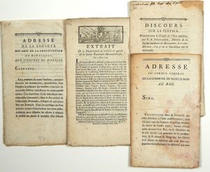 in-8° - (Extrait des délibérations du Comité de la Garde Nationales Strasbourgeoise; Adresse à MM. les Bas-Officiers, Soldats, Cavaliers des Régiments de Royal Infanterie, Strasbourg artillerie, & Royal & Artois Cavalerie. Extrait du Conseil général des Ville et Sénéchaussée de BREST; Extrait des Délibérations du Conseil d'Administration du Régiment National de BESANÇON; Adresse des Soldats du régiment de METZ, Artillerie.) + “ADRESSE de la Société des AMIS DE LA CONSTITUTION de MONTAUBAN, aux Citoyens du District.» - Impr. 14pp in-8°, à MONTAUBAN, 1791. + (ACCEPTATION DE LA CONSTITUTION) «ADRESSE du Conseil Général de la Commune de MONTAUBAN (82), au Roi.» PERIÈS-LABARTHE Maire et les Officiers municipaux - Impr. 11 pp in-8°, chez FONTANEL, père & fils Imprimeurs de la Municipalité, 1792 - “Sire, l'Acceptation libre & solennelle que vous donnâtes à l'Acte constitutionnel, avait été pour tous les français le présage heureux de l'ordre public... Un Roi, Sire, n'a point de parents, n'a point d'amis, n'a point de liaisons. Il ne connait que la Loi, il ne voit qu'elle, & la justice la plus rigoureuse est l'unique règle de sa conduite...” (Mouillures) + DISCOURS sur la Justice prononcé dans le Temple de l'ÊTRE SUPRÊME, par P.A. FONTANEL, Membre de la Société populaire de MONTAUBAN, An 3 - Impr. 16pp in-8°.