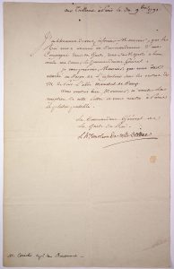 - Louis-Hercule Timoléon de COSSÉ-BRISSAC, Duke of BRISSAC (Paris 1734 - Assassinated at Versailles on Sept. 9, 1792.) Great panetier of France, Captain-Colonel of the Hundred Swiss of the King's Guard, Field Marshal in 1780, Governor of Paris (1775-1791) then Commander-in-Chief of the Constitutional Guard of King Louis XVI (1791) - Letter Signed "L.H. Timoléon de Cossé Brissac" The Commander General of the King's Guard. at the Tuileries in Paris on Sept. 30, 1791. To M. CORIOLIS Captain in the Regiment BOURBONNAIS. He informs him that the King has appointed him to the Command of a Company in his Guard, "of which His Majesty has been kind enough to give me the General Command. I warn you, Sir, that you are attached to the Infantry Corps under the orders of M. de Pont L'Abbé Maréchal de Camp". 1p in-folio.