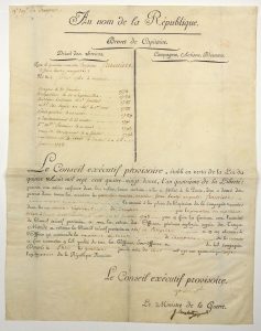 - 9° REGIMENT DE DRAGONS - PATENT OF CAPTAIN in the 9° REGIMENT DE DRAGONS issued to the Quartermaster Treasurer J. Henry FRANCIERE, born in Amiens (80) - given in Paris on May 4, 1793 - Vélin partly imp. (31.5 x 41) - Piece signed BOUCHOTTE (Griffe) Minister of War, and GARAT for the Executive Council - Detail of Services from 1778 to 1793.