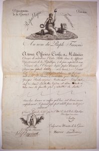 - INDRE & LOIRE] - Large Vignette engraved on the Passport partly imp. of Citizen Jean HARDY born in TOURS Department of INDRE & LOIRE Head of the Second Battalion of INDRE & LOIRE going to TOURS in his Family to restore his health - Done in PARIS, the 22 days of the 1st month of the year 2 (13 Oct. 1793) - 1p large in folio on the letterhead of the Ministry of War (small consolidation). Exhibit signed Xavier AUDOUIN Assistant to the Minister of War.
