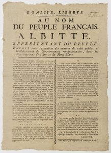 - AIN & MONT-BLANC. 1794. Arrested, in the name of the French People, of ALBITTE Representative of the People, sent, in the Departments of AIN and MONT-BLANC. Done in Bourg Régénéré (01) on 15 Pluviôse Year 2 (3 February 1794). Concerning the rich capitalists or owners of funds who left their communes: "Considering that one of the most perfidious and most disastrous obstacles brought to the progress of the Revolution by the aristocrats, the moderates, the egoists and generally all the declared or hidden enemies of freedom and equality, in order to disgust the people of its sublime work, and to tire them in their constant efforts, was to make them fear, unceasingly....the horrors of famine, and to seek to nationalize misfortune and misery by monopolizing, squeezing and raising the price of grain, food and other necessities...". Impr. at Chambéry (73), at Gorrin Père et Fils. Cupboard (43 x 33 cm) Condition A