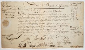 - "ARMY OF SAMBRE AND MEUSE. Division of MONTAIGU." Military leave signed by Generals Anne Charles Basset de MONTAIGU, Louis THORY & Pierre Charles DUMOULIN and the Council of the 162 ½ Infantry Brigade. Done at OSSUM 19 Frimaire year 3 (3 Dec. 1794). Reform leave for André FAUCHEUX, formerly Sergeant. Let us certify that he was seriously wounded in the Affair of FAMARS in 1793 (Old Style), fighting the Satellites of the Tyrants, crippled, was at the Siege of Valenciennes. Patent (21.5 x 37 cm)