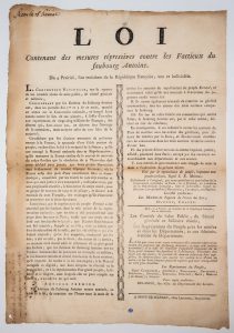 - PARIS. 1795. RIOTS IN THE FAUBOURG ST ANTOINE. "An act containing repressive measures against the factionalists of the FAUBOURG ANTOINE." From 4 Prairial Year 3, May 23, 1795... Published by the Department of LANDES, in MONT-DE-MARSAN, at Leclercq, Printer. "Article 1) The Factieux du Faubourg Antoine will be called upon, in the name of the law, to bring to justice the assassins of the representative of the Féraud people..." Closet (42 x 30 cm) State B+. At the beginning of Year 3 (1795), The Convention, has difficulty in containing the riots in Paris. During the Day of the 1st prairial year III, the crowd goes by surprise to the Convention to ask for bread and forces the entrance. Being in charge of supplying Paris since May 1795, the Deputy Jean-Bertrand Féraud was killed. His head was cut off and walked at the end of a pike through the streets of Paris.