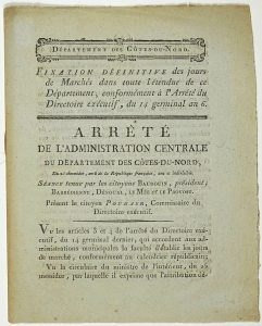 toute l'étendue du Département, conformément à l'arrêté du Directoire Exécutif, du 14 Germinal an 6.» Listes des 43 Communes, avec le nombre de Marché par Décade, et le Jour auxquels ils sont fixés. - Impr. 8pp in-4°, à PORT-BRIEUC (Nom Révolutionnaire de ST-BRIEUC), chez J.M. Beauchemin, imprimeur du Département des Côtes du Nord.