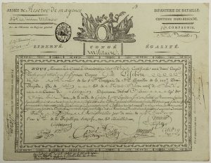 - "RESERVE ARMY OF MAYENCE." Hundredth Half-Brigade Infantry Battle Group. Military leave made in Neuf-Brisach (Haut-Rhin) on the 23rd Messidor Year 6 (July 11th 1798). Exhibit signed by the Council of the said Half-Brigade. Absolute leave to the citizen Gilles LEFEBVRE Soldat, native of Ille-et-Vilaine, who served with Probité, Bravoure et Civisme. Patent (26 x 34 cm)