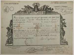 - CAMPAIGNS IN INDIA. Military leave signed by MASSOL Divisional General, Commander-in-Chief and Council of the 26th Half Infantry Brigade. Done at GRENOBLE (38) 4 Nivôse Year 7 (24 December 1798). Reform leave, by duplicate, issued to Augustin MOUCHOT Corporal, native of ALLAIN (Meurthe et Moselle), who served from 1774 to 1785, Wounded in 1783, the said Mouchot made the Campaigns of INDIA from 1780 to 1784. Patent engraved (24 x 32 cm) filled with ink. Decorated with soldiers.