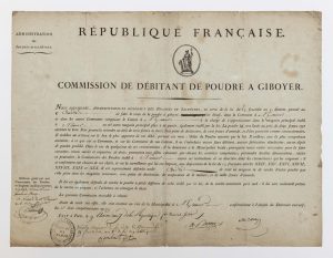 - BELGIUM. 1799. NAMUR (Department of the Dyle.). Commission de débitant de POUDRE A GIBOYER dans la Commune de NAMUR délivré à ANDRÉ. Document signed by the Administrators of Powders and Saltpetre of the French Republic: A. BOTTÉE & DUCAMP, made in Paris 9 Pluviôse Year 7 (28 January 1799). Aimed at the NAMUR Town Hall.
