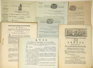 Grande-Armée, Instructions; Arrêté des Consuls de la République françaises relatif aux Conscrits du 18 Thermidor an 10; Loi relative à la levée des Conscrits de l'an 11 et de l'An 12. Un Avis aux Conscrits du Puy-de-Dôme. Ensemble comprenant 5 Vignettes.