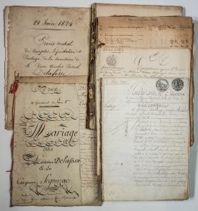 - PARIS. Famille DELAFOSSE Ancien Capitaine d'Infanterie. 14 Documents dont 2 forts cahiers de comptes, de 1800 à 1865. Lettres, Comptes, Succession, Testament, etc.