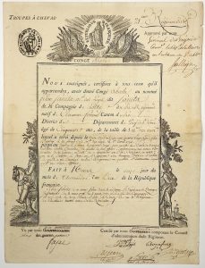 obtenu le présent congé pour passer à l'école de Musique militaire établie à Versailles. Fait à NEVERS (58) le 16 Thermidor An 10 (4 Août 1802). Congé signé du Général de Brigade Charles SALLIGNY DE SAN GERMANO (1772-1809) Commandant le Département de la Nièvre, du Général Gabriel de SOMBS DE FAJAC Sous-Inspecteur aux Revues, et du Chef de Brigade Ythier Silvain PRYVÉ (Général en 1807) - Grand certificat gravé, rempli à l'encre (33 x 24,5 cm).