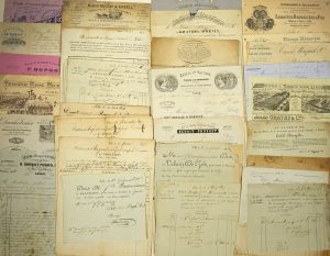- LILLE (59) COLLECTION of 46 LILLE INVOICES from Year 9 (1801) to 1905, almost all different, and 6 Letters of Exchange from LILLE merchants. qs defects: DEFOSSEUX-VIRNOT, sale and delivery of goods, in Lille Year 9 + BAUDECHON, delivery of bags of flowers, payable in ecus, Lille Year 10 + FROMONT-RIQUIER Md Ébéniste et Marbrier, 61 rue Esquermoise in Lille 1818 + DANEL, King's Printer and Bookseller, in Lille 1819 + CAUVAIN-GÉRIN Manufacturer of canvases and sarals, rue de Paris, N°81, Lille 1822 + "AU GLAND D'OR" CORBEL- DESNOYELLE, 3 rue des prêtres Lille 1824 + VIDAL & Cie Toiles, 10 rue Neuve, Lille 1837 + Fabrique de CARDES, SCRIVE Frères, in Lille 1838 + Plomberie de DESPLANQUES, 4 Place du Château in Lille 1855 + CHOCQUET-PIGNATEL Fils 13 place aux Bleuets in Lille 1860 + REVILLE 1 DARTOUT Fabriques de Tulles en tous genres, 5 rue d'Amiens Lille 1868 + BERNARD & DEVOS, Toiles et Sarraux, 95 rue de Paris Lille 1871 + MEUNIER-STERLIN, Canvas factory in HALLUIN, Forwarding house 16 rue de Moline Lille 1871 + BENOIT-PRUVOST Bonneterie, Ganterie, 19 rue de Grande-Chaussée in Lille 1875 + VRAU & Cie Linen threads to sew, Manufacturers in Lille 1876 + ORLIAC & BONNEL Transport company, 2 rue des trois mollettes Lille 1876 + WICARD Frères, Tissage de toiles et damassés, 246 rue de Paris Lille 1879 + DUPONT Produits chimiques et pharmaceutiques, 130 Bld de la Liberté Lille 1897 + STIEVENARD-THOMAS Laines à matelas, 1 rue du Pont-à-Raines Lille 1899 + Brasserie MASSE-MEURISSE 112 rue de la Barre Lille 1904 + CREPIN Manufacture de confections, 92 rue du Port Lille 1905.