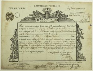 lequel a Servi depuis 1777 au Régiment de Bourbonnais, et en 1792 jusqu'à l'An 9 (1801). Brevet gravé (25 x 34 cm) rempli à l'encre, décoré de soldats.
