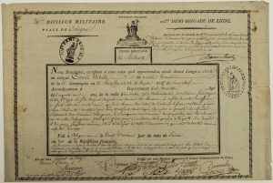 (Allemagne) le 23 Pluviôse An 10 (12 février 1802). Congé de Retraite au citoyen Conrad NIKELS, dit NIKELS Tambour de la 3ème Compagnie, natif du département de la MEURTHE. Ce militaire sert depuis 1778 et s'est toujours comporté avec honneur et bravoure. Au verso, certificat de visite médicale de l'Hôpital de Cologne. Estropié, «il éprouve de la gêne en marchant, ayant eu les pieds gelés dans la première Campagne des Grisons.» Brevet gravé (26 x 39 cm) rempli à l'encre.