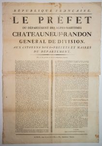 - ALPES-MARITIMES. 1802. "The Prefect of the Alpes-Maritimes department CHATEAUNEUF-RANDON Major General, to the citizens sub-prefects and mayors of the department." Cupboard (76 x 53 cm) made in NICE (06) on 26 Pluviôse year 10 (15 February 1802). Speech of Châteauneuf-Randon at the time of taking of his functions of Prefect of the Alpes Maritimes. "...France victorious over her enemies by the courage of her defenders, by the strength of her principles of philosophy, humanity, justice and tolerance, especially by the great heroic virtues of the First Consul BONAPARTE is at the forefront of all European nations, and there are none that are not proud to be part of it. Blessed are the countries united in the French Government. Blessed above all are the inhabitants of the Alpes-Maritimes who, by their topographical position, are in a position to make the most of their industry and their precious foodstuff; but to achieve this, the individual will of all citizens is required...". (Excerpt). Printed in NICE (06), at Cougnet Père et fils, Imprimeurs-libraires.
