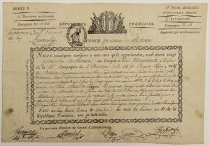 - LE PUY (HAUTE-LOIRE). 1802. Military leave signed by the Council of the 21st ½ Light Infantry Brigade. Done at Le PUY, Haute Loire 13 Prairial year 10 (2 June 1802). Temporary retirement leave issued to citizen René MURSEAUX Chasseur of the 3rd Company, native of BELLEVILLE (Deux-Sèvres), who served with honour, bravery & probity, since 1793, did all the Revolutionary Campaigns at the Consulate, in the Armies of the Rhine, Italy & EGYPT. Patent engraved (21 x 31 cm), filled in ink. Vignette.