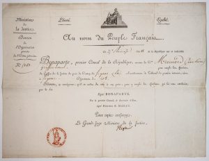 - LOT. 1803. JUSTICE - Grand Brevet delivered by the Office of the Organization of the Judicial Order on 25 Pluviôse Year 11 (14 February 1803): "BONAPARTE Premier Consul" (Heading, label) - Appointment of Jean Pierre MAINARD to carry out the functions of Clerk of the Justice of Peace of the Canton of FIGEAC. Exhibit signed REGNIER Le Grand Juge Ministre de la Justice - 1p (33 x 44) oblong.