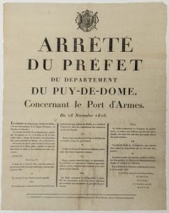 - PUY-DE-DÔME. 1806. PORT OF WEAPONS. Order of the Prefect of the Department of Puy-de-Dôme, concerning the Carrying of Arms. November 28th 1806. Printed in CLERMONT (63), at Landriot. Vignette Empire. Cupboard (51 x 45,5) State A.