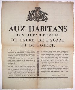 - YONNE. AUXERRE 15 April 1814. Address of Ferdinand, Baron d'ULM, "Aux Habitants des Départements de L'AUBE, de L'YONNE et du LOIRET." Closet (38.5 x 31). Printed in AUXERRE, by Laurent FOURNIER's printing house; 1814. Vignette Royale. "The Allied High Powers have entrusted me with the General Government of your Departments. The maintenance of public rest, the personal safety of the inhabitants and their properties, are the care most dear to the hearts of the Sovereign Allied Augustinians.... Your Augustus King Louis XVIII will consolidate the happiness of France..."