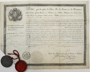 - ORDER OF ST. LOUIS. 1814. Patent of Knight of the Royal and Military Order of SAINT-LOUIS, in favour of Sieur SAISI de KERAMPUIL, Former Officer. Exhibit signed LOUIS Sovereign Chief, Grand Master and founder of the Royal and Military Order of Saint-Louis (Secretary), countersigned by Count DUPONT; and signed DAMBRAY Chancellor of France. Given in Paris on 5 September 1814. Diploma engraved on vellum (31.5 x 41 cm) filled in ink, with wax seal in a round zinc box (Diameter 5 cm).