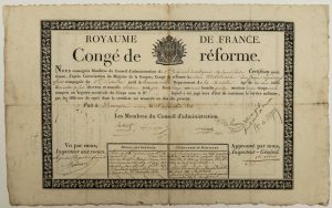 - BOURGES (Cher) 15 September 1814. Military leave signed by the Council of the 11th Regiment of VOLTIGEURS, Ex Jeune Garde (Imperial) and General Comte Jean-François LEVAL, as Inspector General. Reform leave of a Soldier of the Empire, Sieur Jean François MARLINOT, Adjutant of the 1st Battalion, native of HANNONVILLE (Meurthe et Moselle; sic Erreur Moselle), Knight of the Legion of Honour in 1813. He made the Campaigns from 1805 to 1814 in Austria, Prussia, Poland, Spain, in the Grande Armée, wounded by two shots in 1807 and 1809. Patent engraved (26 x 42 cm), filled in ink. Royal Vignette.