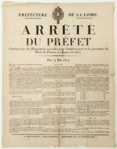 - THE LAW. 1817. RIGHT OF PATENT. "Order of the Viscount de NONNEVILLE, Prefect of the Loire, of 14 May 1817, containing new provisions for the establishment and collection of the Patent Fee from 1817 onwards." Cupboard (53 x 41) State B+.