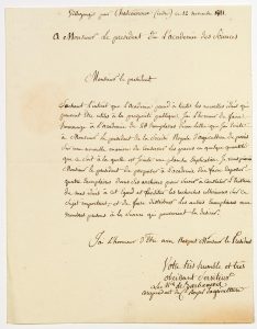l'Indre. 3 Lettres autographes signées: Lettre A.S. le Marquis de BARBANÇOIS Correspondant du Conseil Royal d'Agriculture, du Château de VILLEGONGIS par Châteauroux (Indre) le 12 Nov. 1821 - au Président de l'Académie des Sciences - 1p petit in-4° - «...J'ai l'honneur de faire hommage à l'académie de 20 exemplaires d'une Lettre, que j'ai écrite à Mr le Président de la société Royale d'Agriculture de Paris, sur la manière de conserver les grains en quelque quantité que ce soit à laquelle est joint une planche explicative...» + 2 Lettres A.S. de VILLEGONGIS 1819 adressée à THUROT Professeur de Littérature grecque au Collège de France.