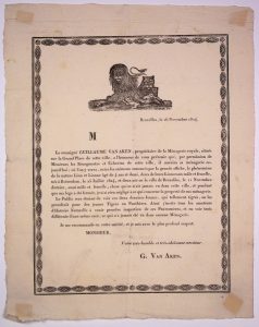 - HOUSEHOLD. BRUSSELS 16 November 1824. Advertisement 1p in-4°. "Guillaume VAN AKEN, Owner of the royal menagerie, located on the Grand'Place of this City has the honour to warn you that... he will open his menagerie today, where we will see, in addition to the animals announced by the big poster, the phenomenon of the Lion and Lioness nature... and their cubs... So I invite all lovers of Natural History to come and take a look at these phenomena..." - Vignette representing the lion, the lioness and the cubs.